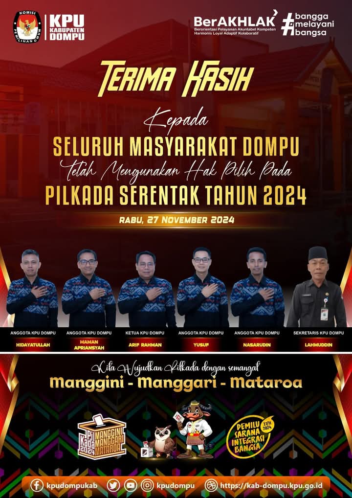 Komisi Pemilihan Umum (KPU) Kabupaten Dompu Mengucapkan Terima Kasih Kepada Seluruh Masyarakat Dompu yang telah menggunakan hak pilih Pada Pilkada Serentak Tahun 2024, pada hari Rabu, (27/10/24) beberapa hari yang lalu.