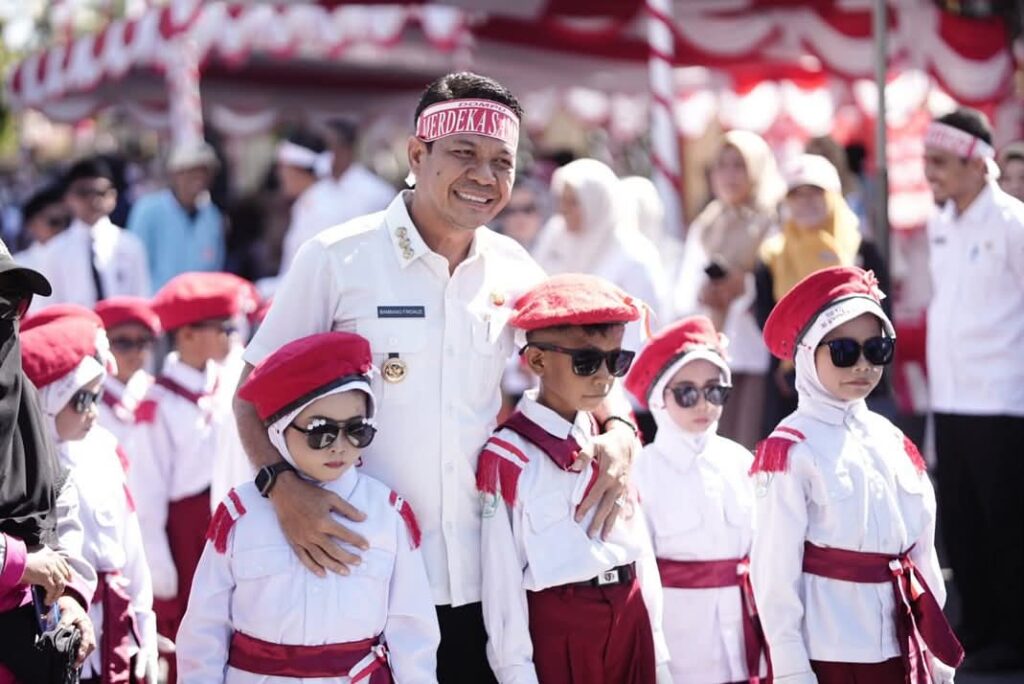 Dalam gambar terlihat Bupati Dompu, Bambang Firdaus, SE atau yang akrab disapa Papi Bambang sedang bersama anak-anak Bumi Nggahi Rawi Pahu (Kabupaten Dompu) di momen gerak jalan tingkat Sekolah Dasar dalam rangka memeriahkan Peringatan Hari Ulang Tahun Ke-80 Kemerdekaan Republik Indonesia Tahun 2025.