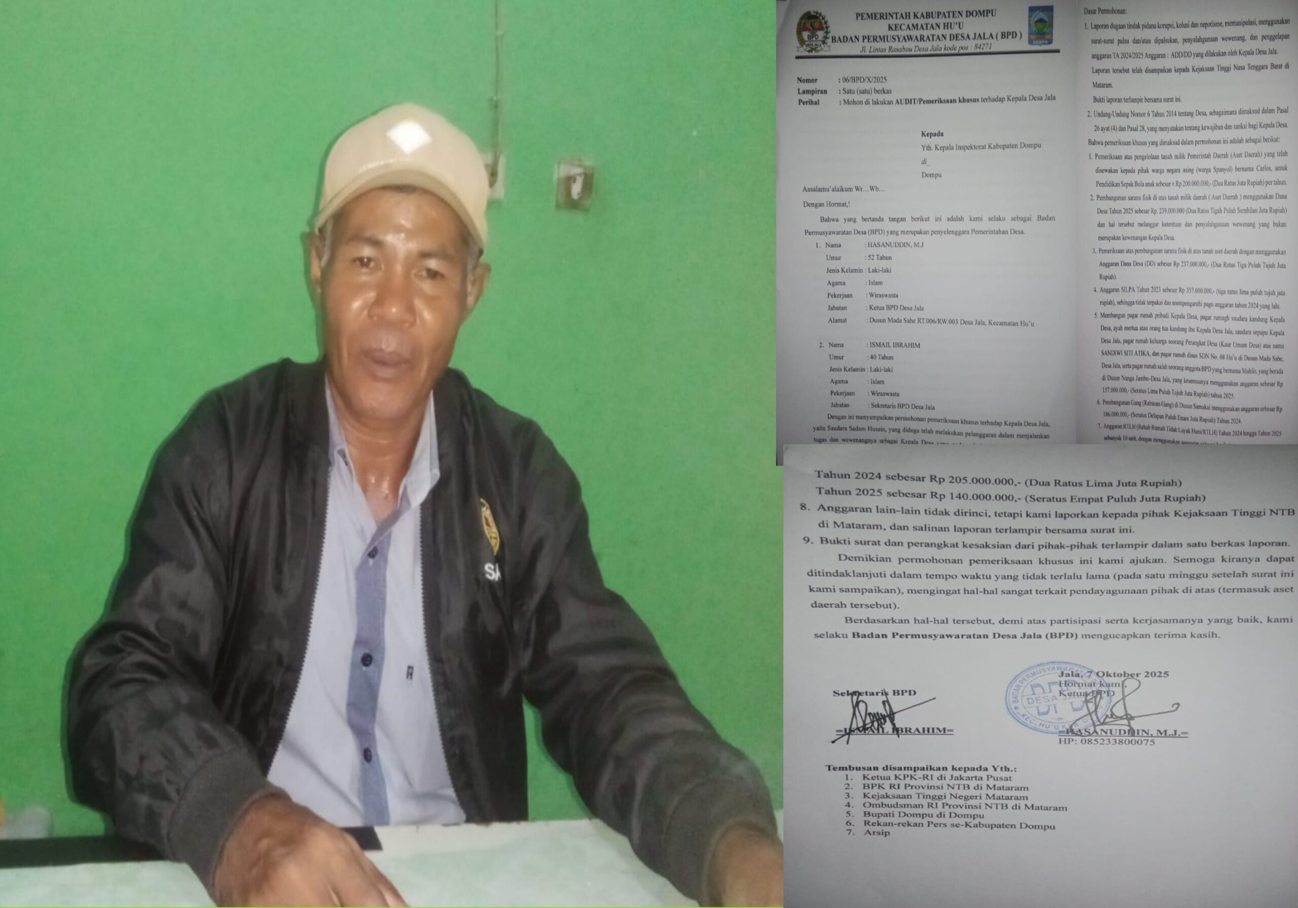 Dompu, NTB, ChanelNtbNews – Badan Permusyawaratan Desa (BPD) Desa Jala resmi melayangkan Surat Permohonan Audit dan Pemeriksaan Khusus Kepala Desa Jala Kecematan Hu’u Kebupaten Dompu Terkait Dugaan Penyalahgunaan Anggaran tahun 2024/2025.