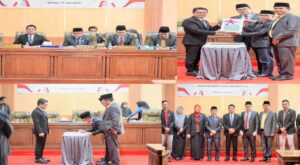 Foto, Bupati Dompu Bambang Firdaus, SE, saat saat sampaikan secara resmi Raperda pertanggungjawaban APBD tahun anggaran 2024 di Gedung DPRD...