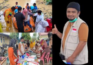 Foto, Dr. Muhsin, tenaga medis Kabupaten Dompu yang sedang melayani para korban banjir bandang di Aceh Dompu,...