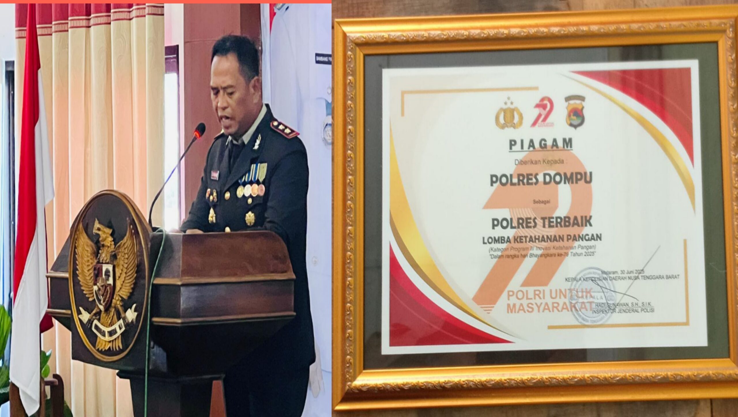 Penghargaan tersebut diberikan pada momen upacara peringatan Hari Bhayangkara dan terima langsung oleh Kapolres Dompu AKBP Sodikin Fahrojin Nur, S.IK, di kota Mataram, (30/06/25) kemarin