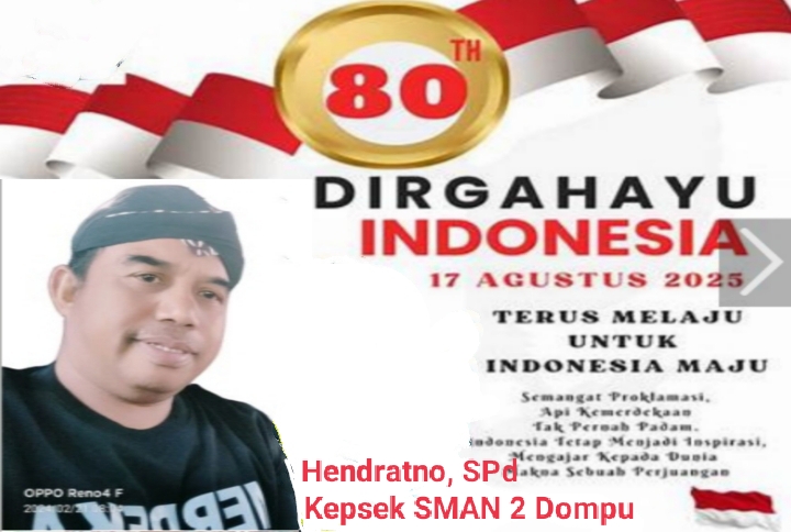 Dompu, NTB, ChanelNtbNews – Kepala Sekolah SMAN 2 Dompu, Hendratno, SPd, Beserta Seluruh Guru dan TU Mengucapkan Dirgahayu RI yang ke-80 Tahun 2025.