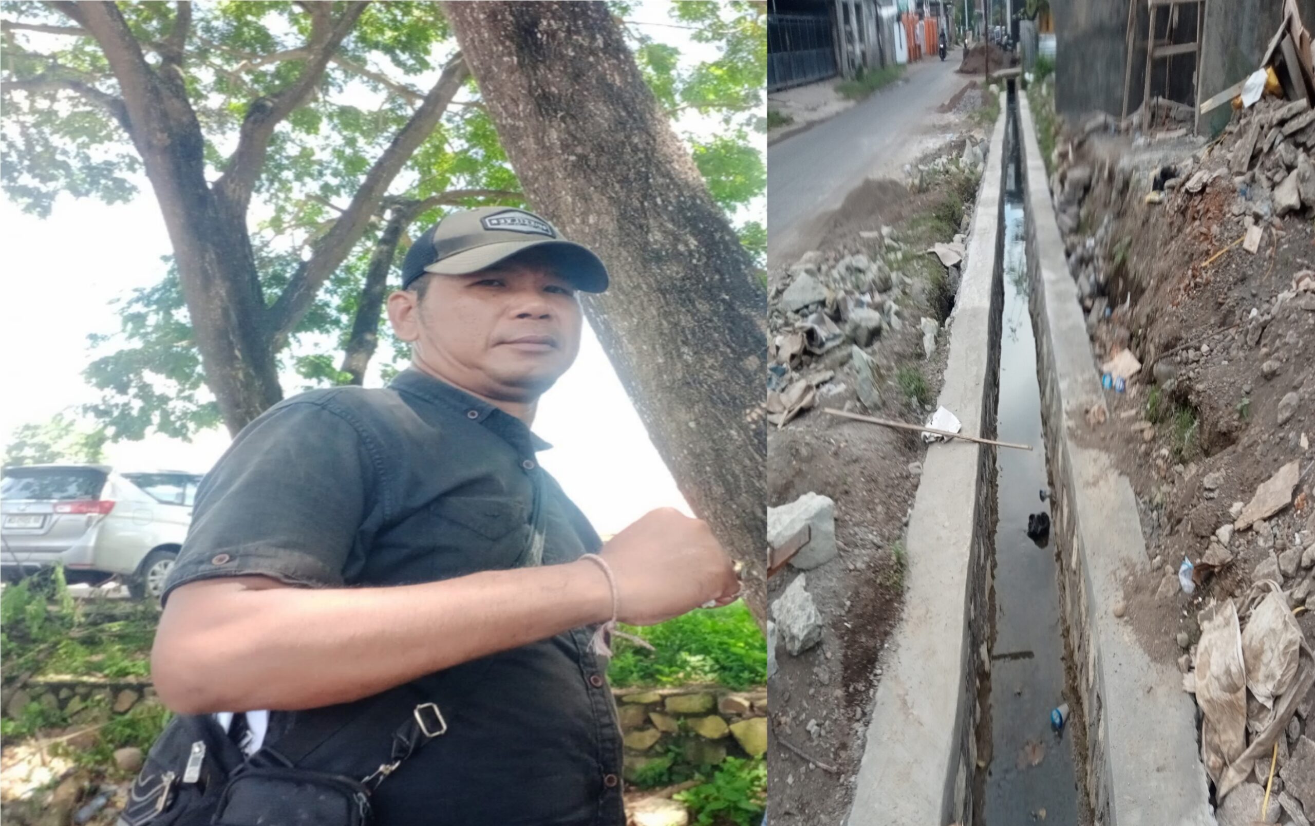 Foto, Anggota Gerakan Rakyat Anti Korupsi (Gerak) Dompu Fauzid dan Kondisi Pekerjaan irigasi di jalan potong Kelurahan Bali Satu