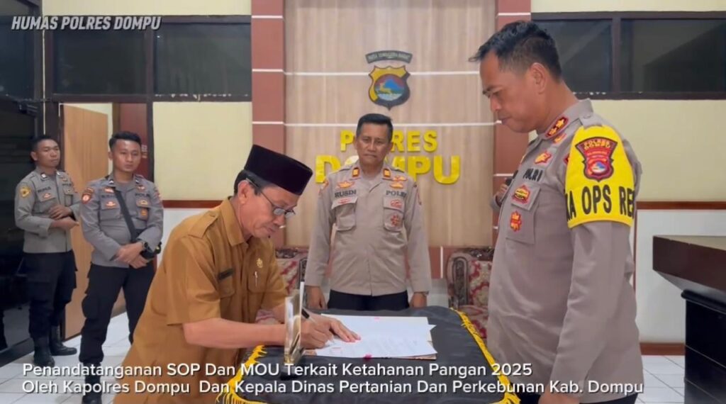 Polres Dompu bersama Dinas Pertanian dan Perkebunan (Distanbun) Kabupaten Dompu resmi menandatangani Nota Kesepahaman (MoU) dan Standar Operasional Prosedur (SOP) Ketahanan Pangan Tahun 2025.