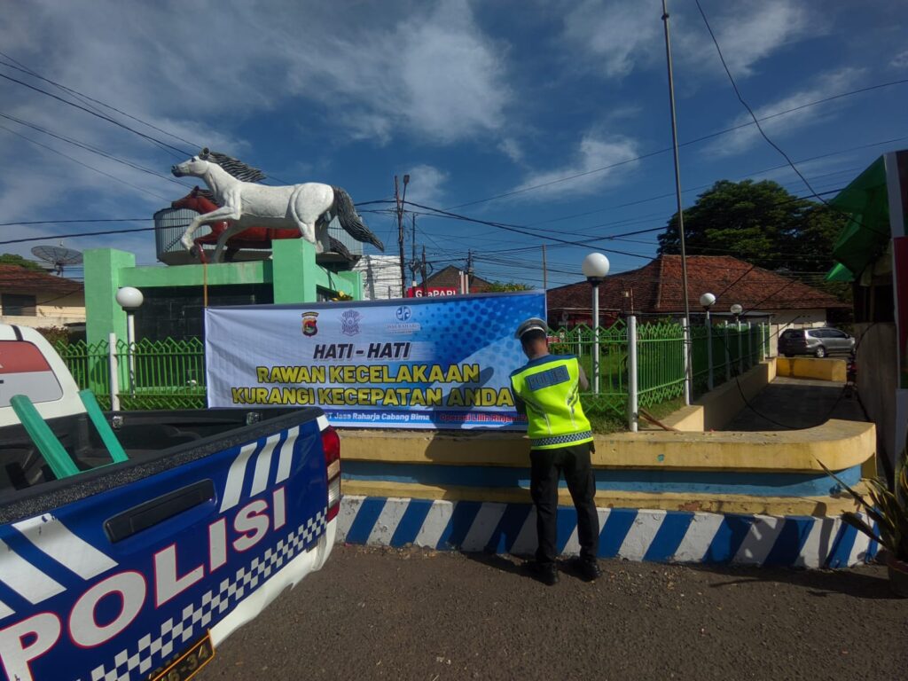 Satgas Kamseltibcarlantas Operasi Lilin Rinjani 2025 Polres Dompu melakukan kegiatan pemasangan spanduk imbauan keselamatan berlalu lintas di sejumlah titik strategis wilayah Kabupaten Dompu.