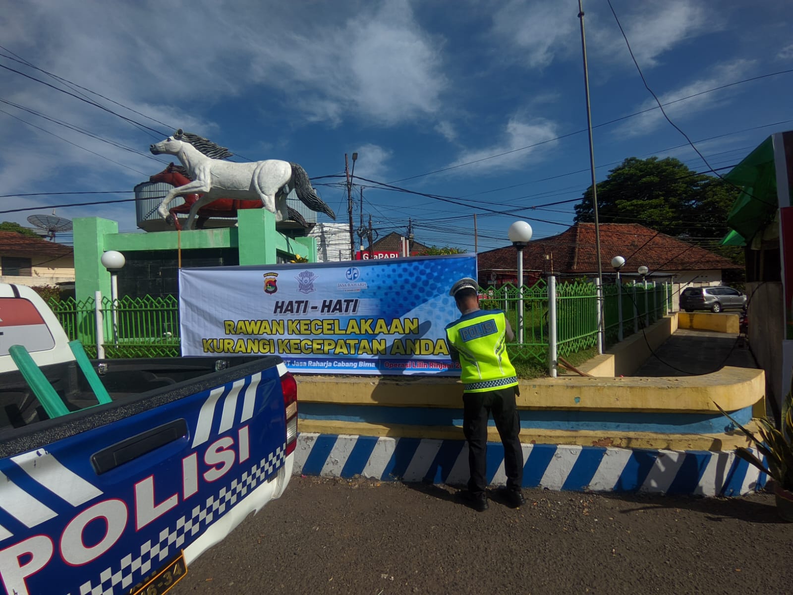 Foto, Satgas Kamseltibcarlantas Operasi Lilin Rinjani 2025, saat melakukan Pemasangan Spanduk Imbauan Keselamatan Berlalu Lintas di Titik Strategis.